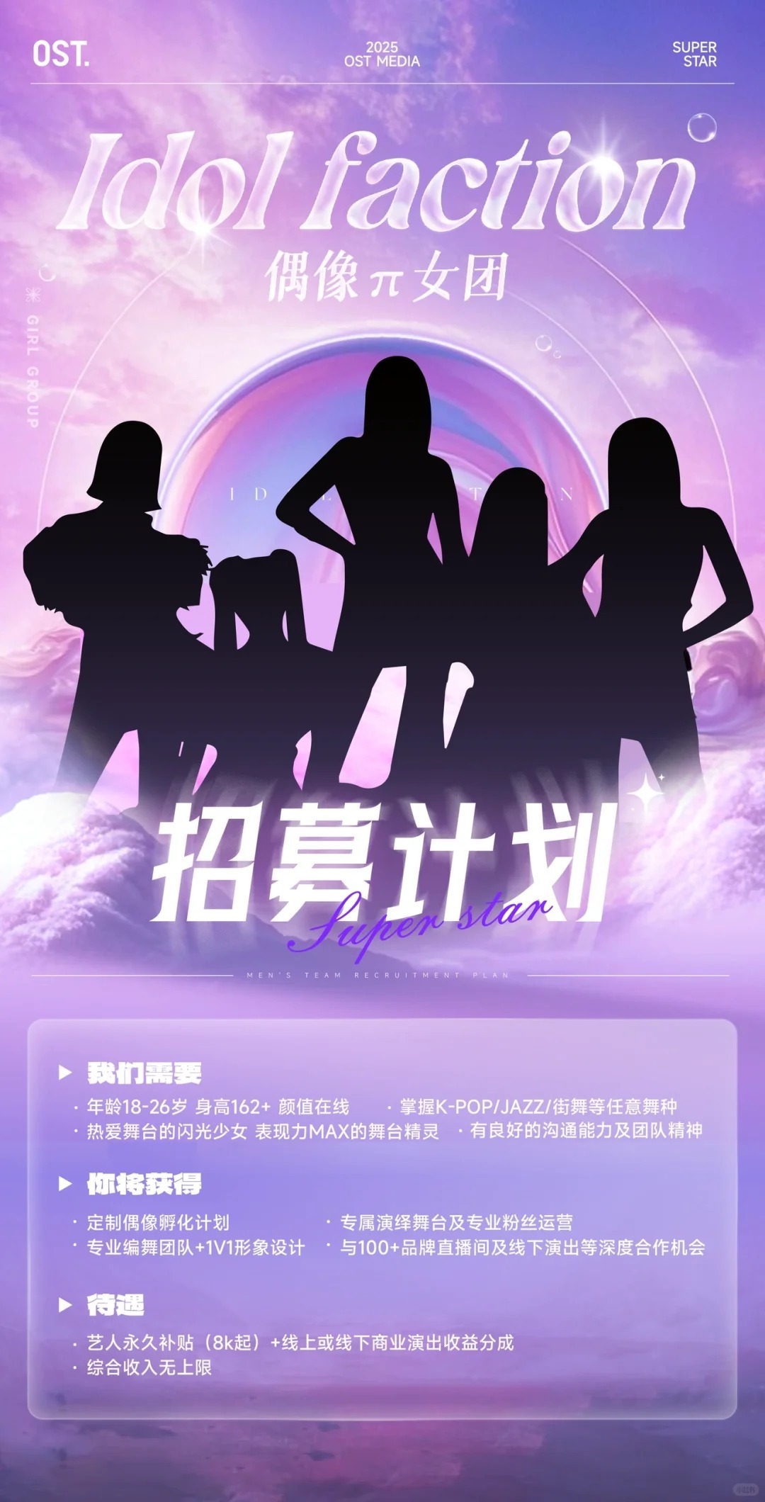某社交平台也有不少主播招募信息,如OST公社的女团招募计划要求“掌握K-POP、JAZZ街舞等舞种”“强舞台表现力”。